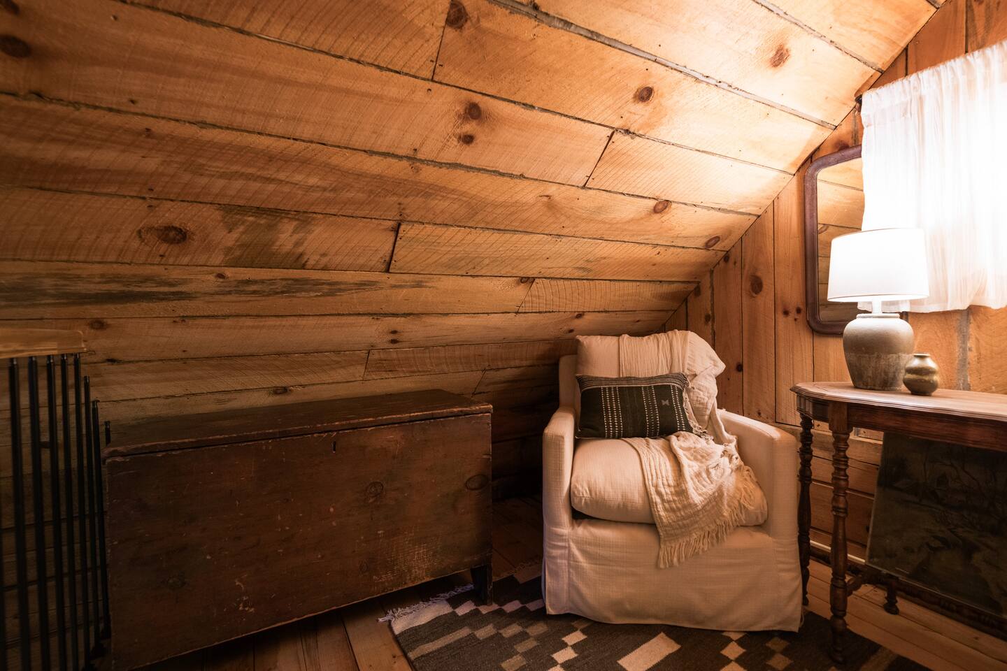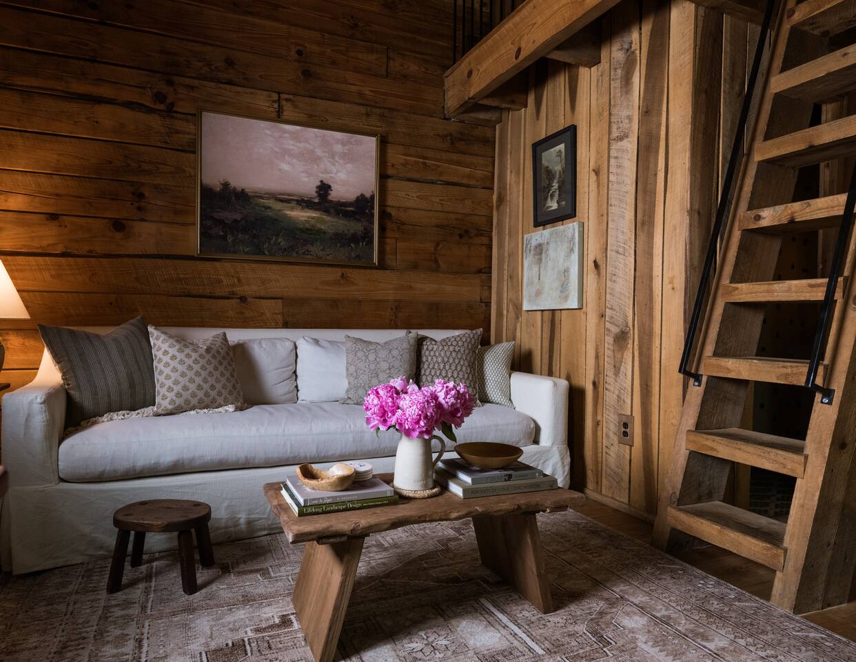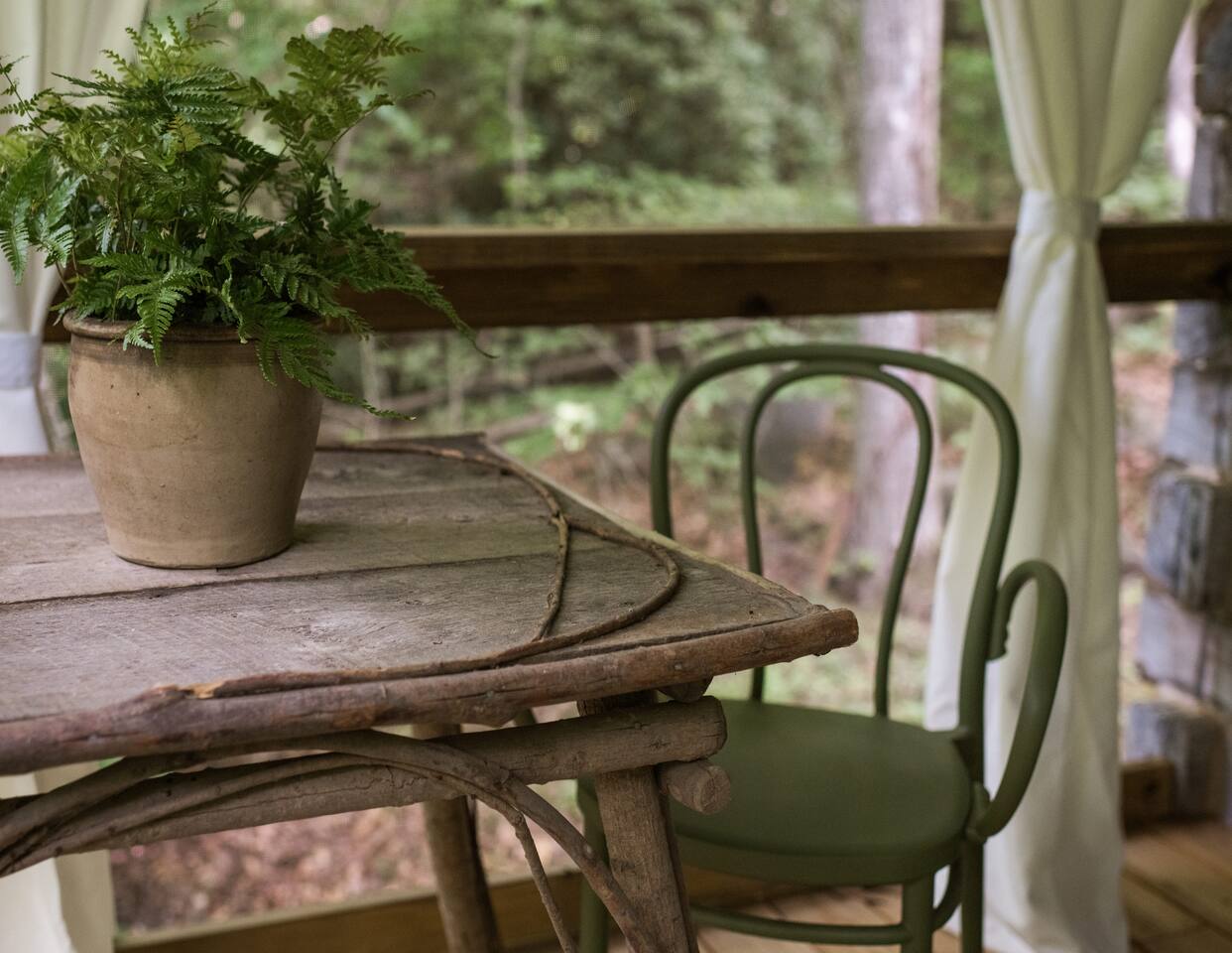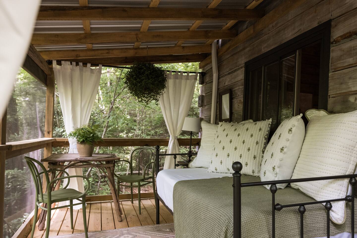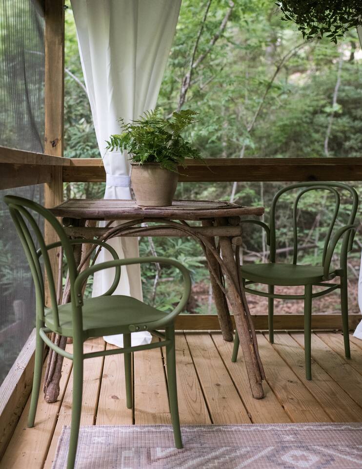 Nestled in the serene mountains of Montreat, North Carolina, our guest house cabin for two offers a perfect blend of rustic charm and modern comfort. Elegantly interior designed, the cabin boasts warm wooden accents, plush furnishings, and tasteful decor that create an inviting atmosphere. A highlight is the sleeping porch, where you can enjoy the peacefulness and stunning mountain views. Experience the perfect romantic retreat in this beautifully designed cabin.